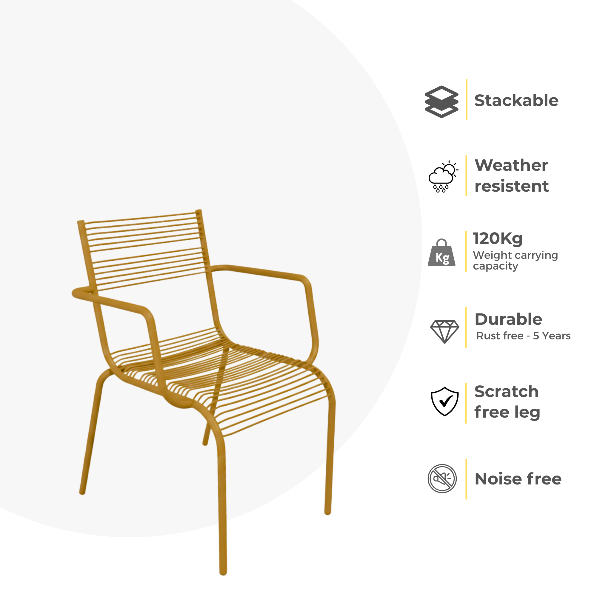 Stackable and easy to move with weight carrying capacity of 120kg. Available with legs for a scratch proof floor.