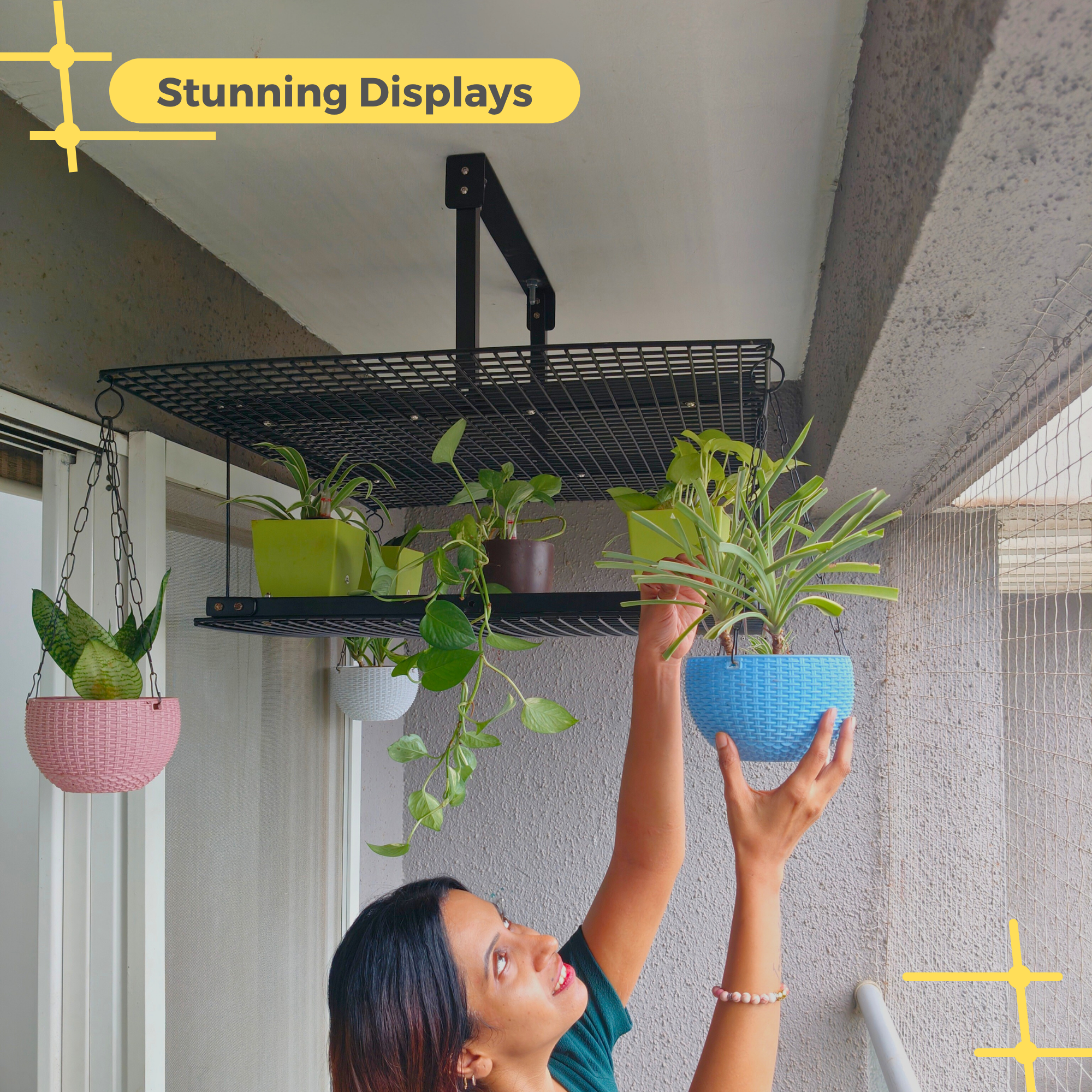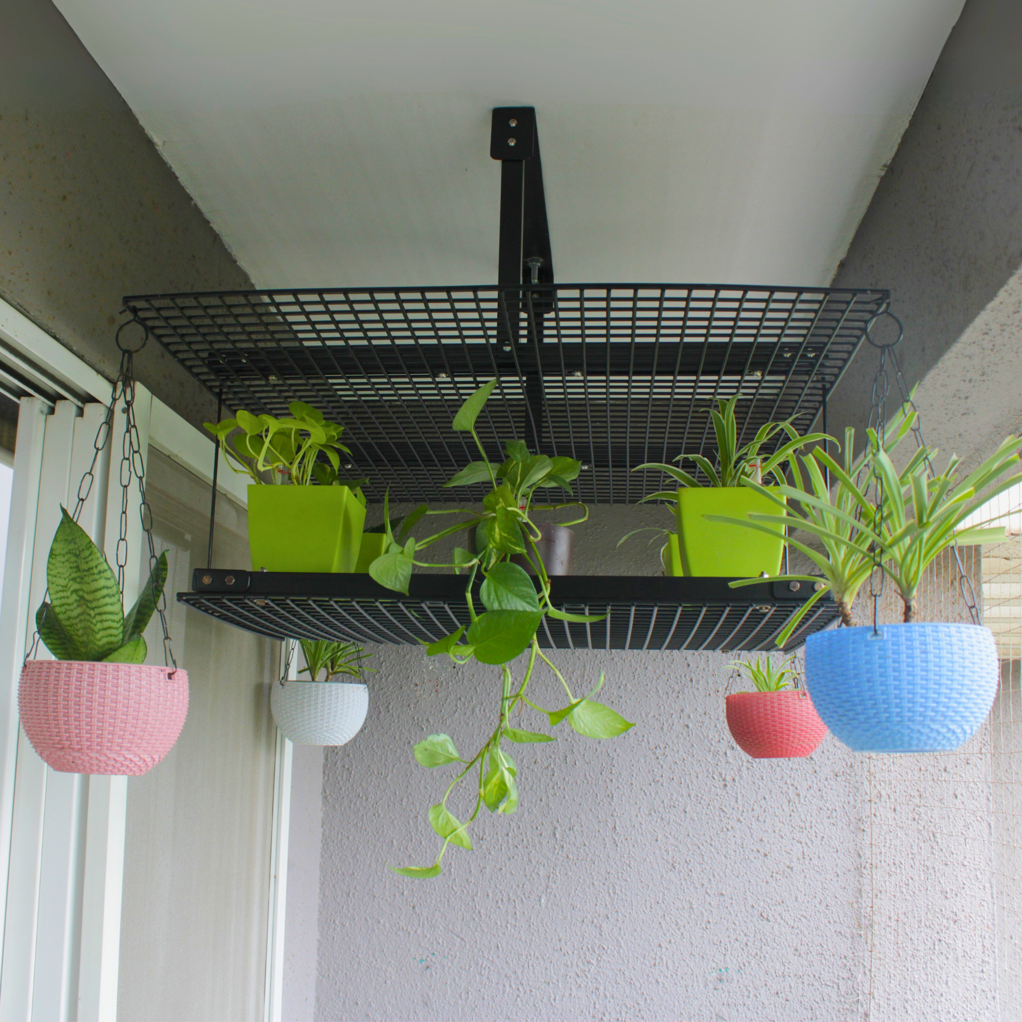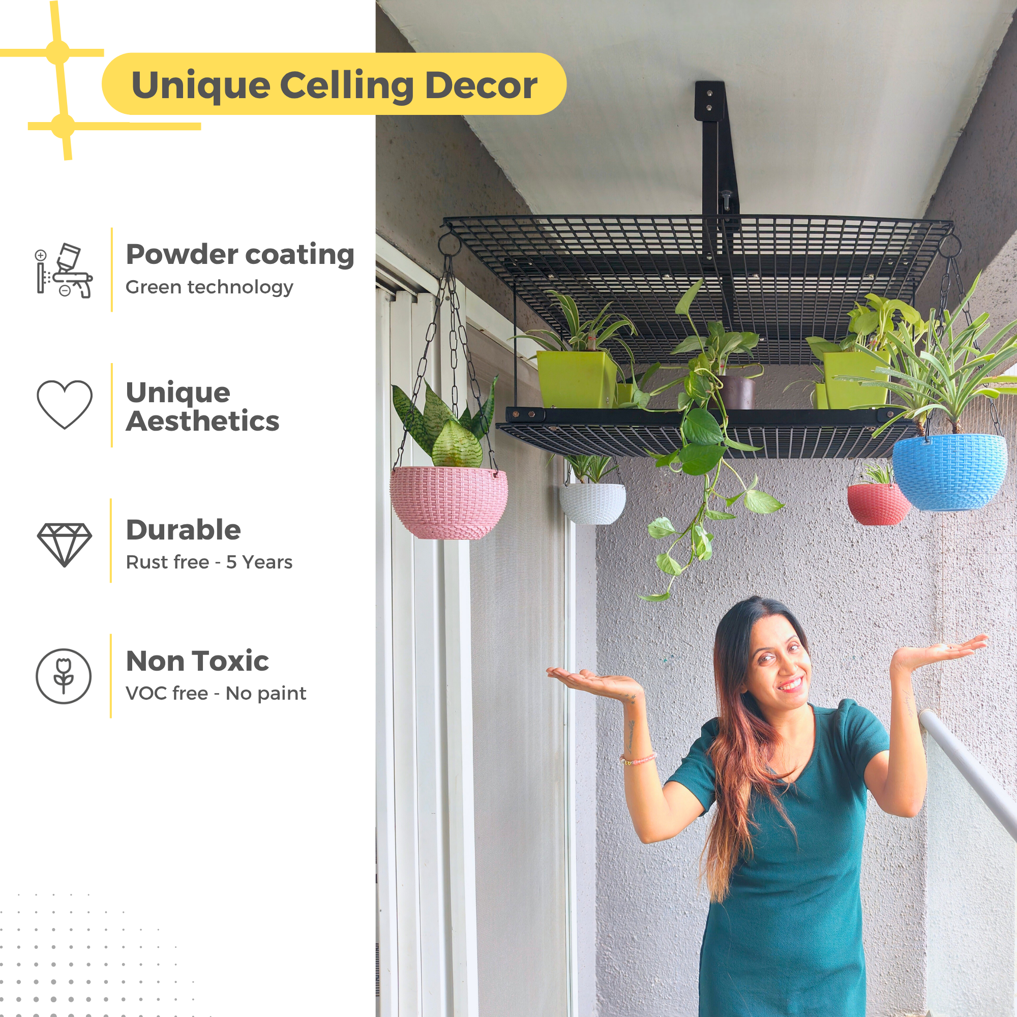 Sora's two layered grid gives a large surface for your hanging pots and creeper plants. With light fittings and other accessories, it can act like a beautiful centre piece over a dining set or a bar.