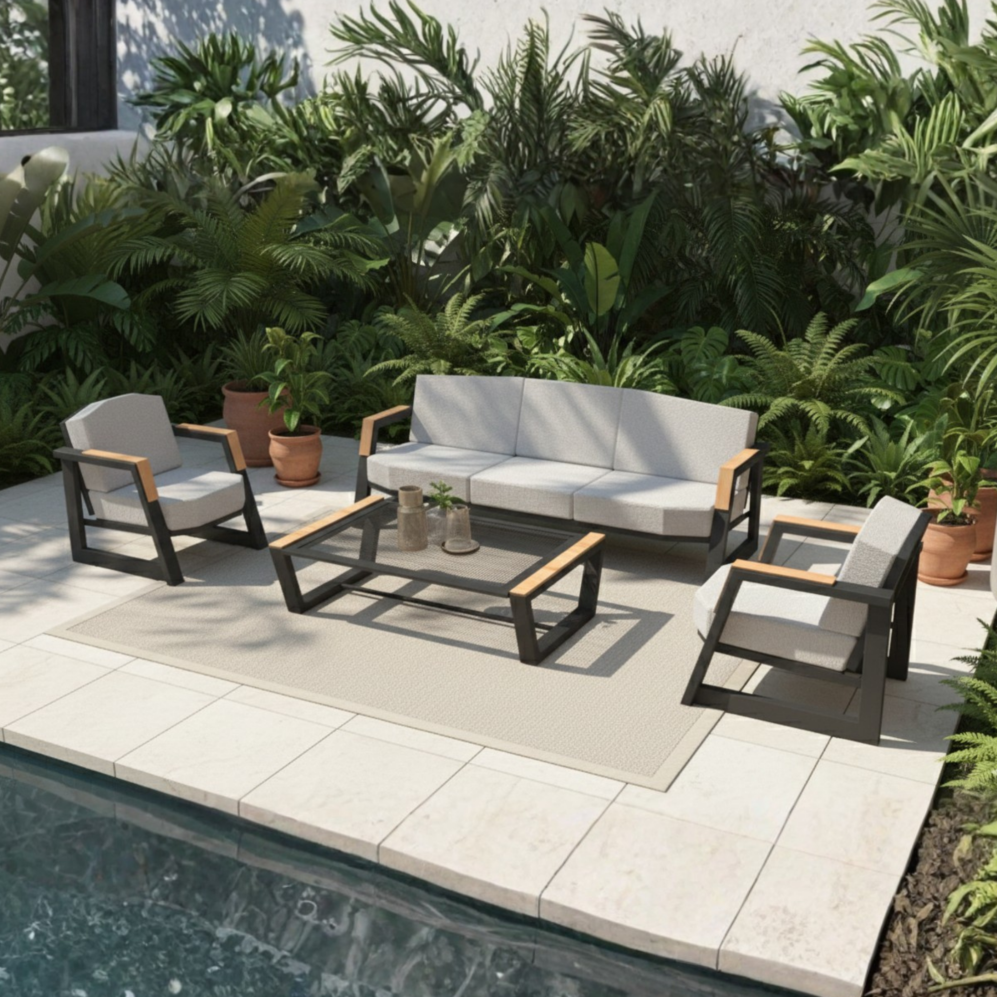 This furniture is manufactured with high quality Mild Steel sections finished with exterior grade dual powder coating under controlled factory environment. The upholstery/cushions are crafted to match its angular form with high density foam and outdoor grade fabrics.