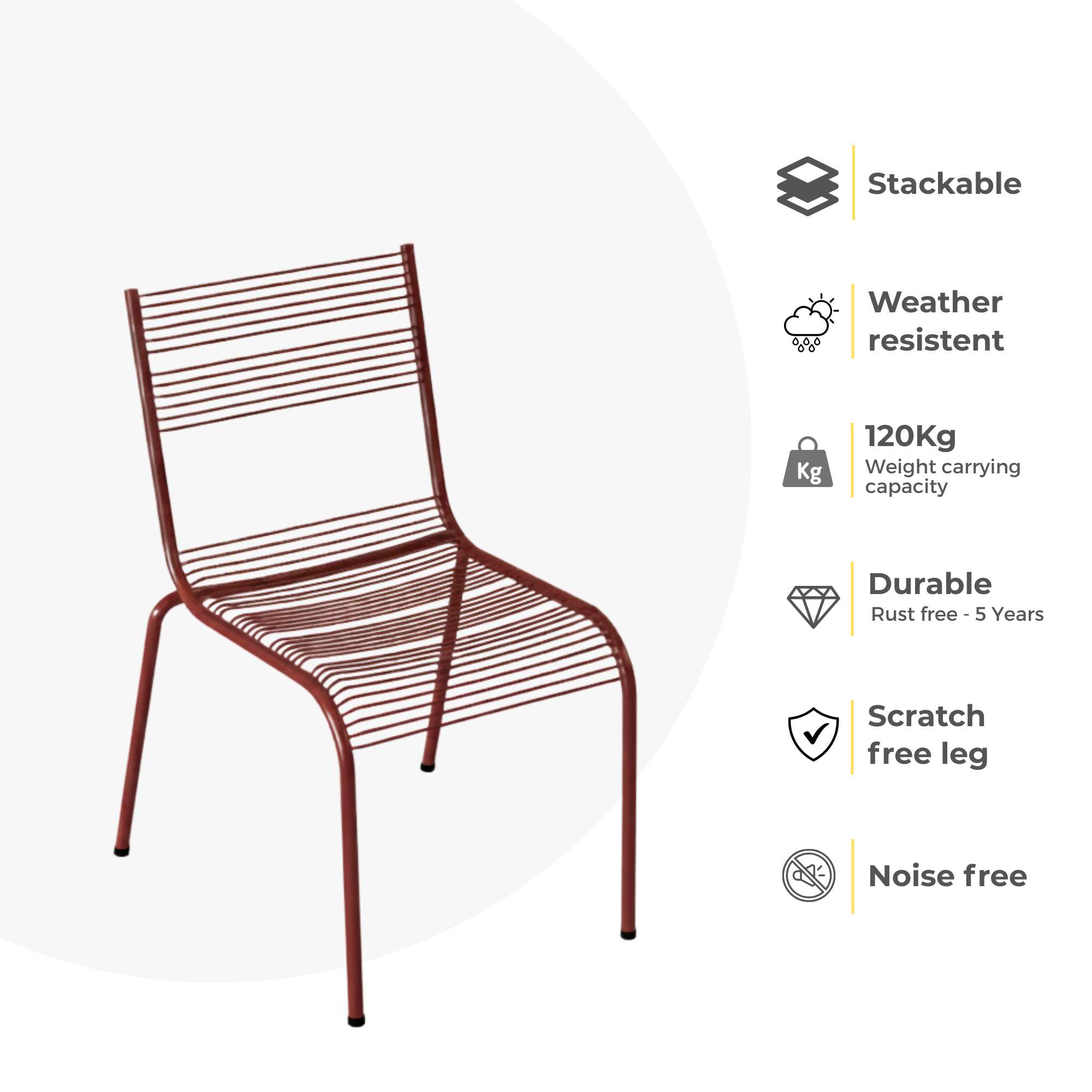Stackable and easy to move with weight carrying capacity of 120kg. Available with legs for a scratch proof floor.
