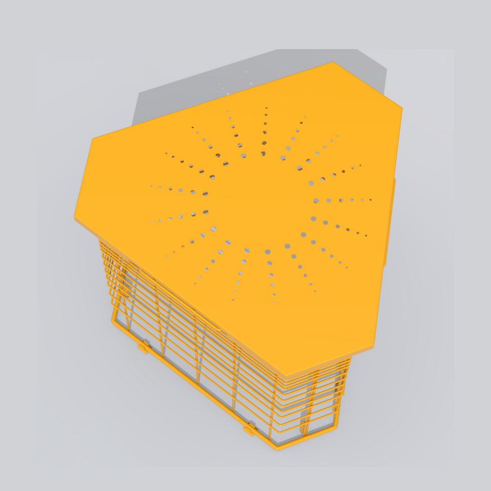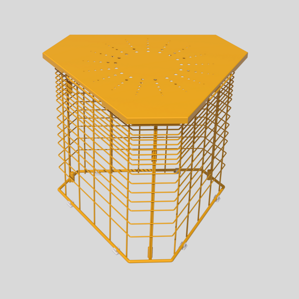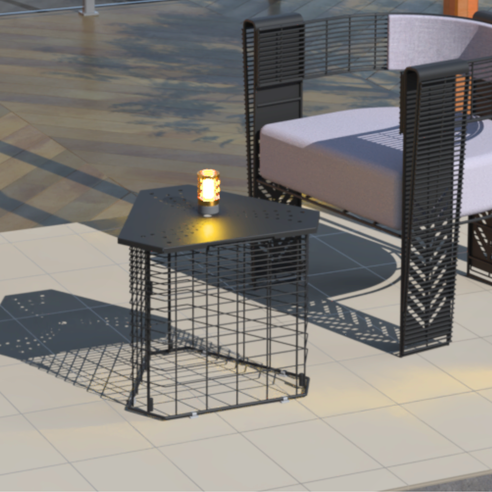 Hexagonal center table with powder-coated GI welded mesh base and metal sheet top which is weather-resistant and scratch-resistant.