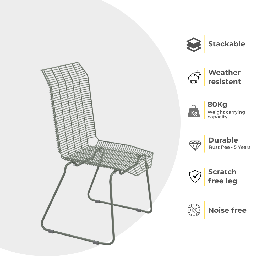 Stackable, weather resistant with 120kg weight carrying capacity. Available with plastic legs for scratch free floor.
