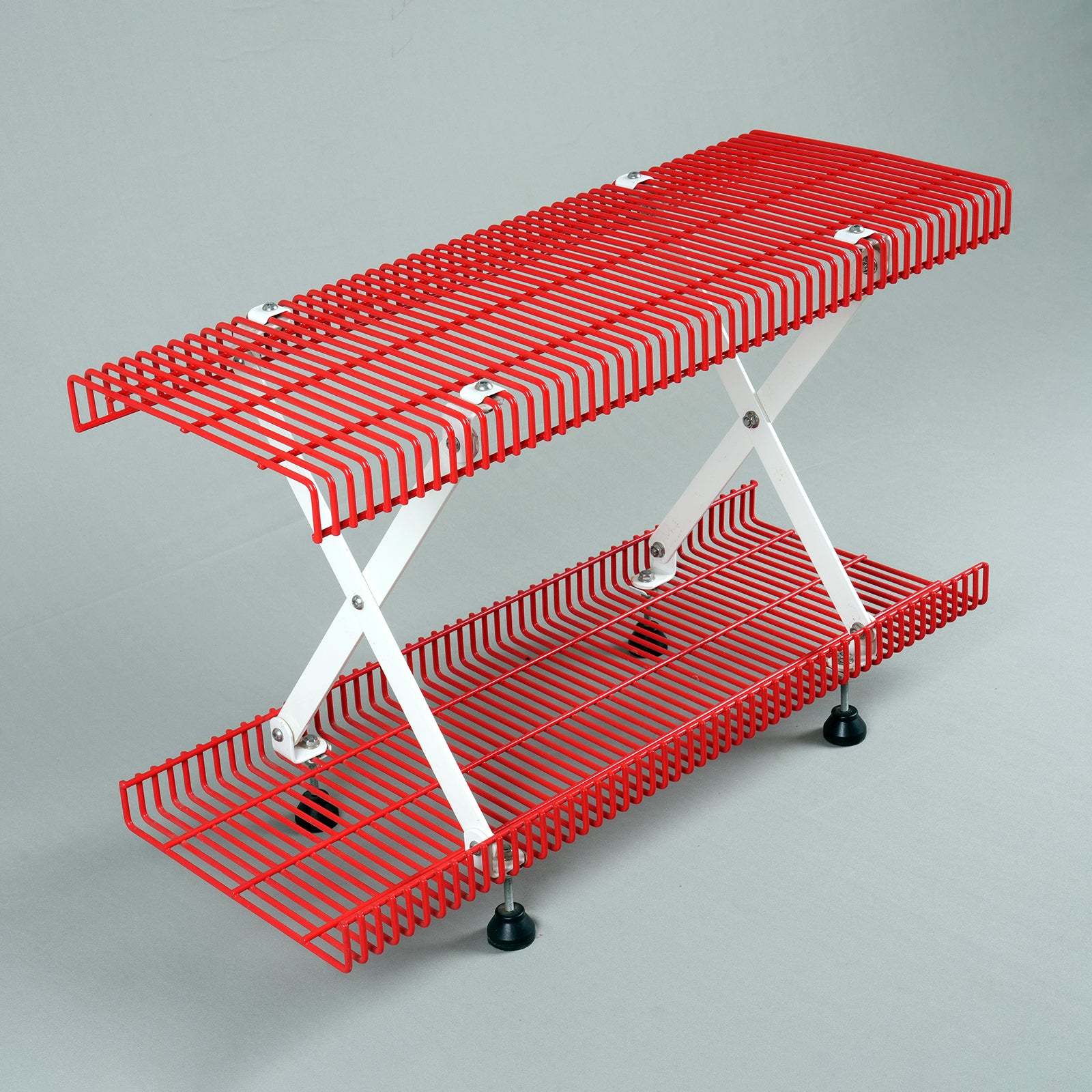 An aesthetically pleasing tiered stand with scissor supports giving it an exceptional character.