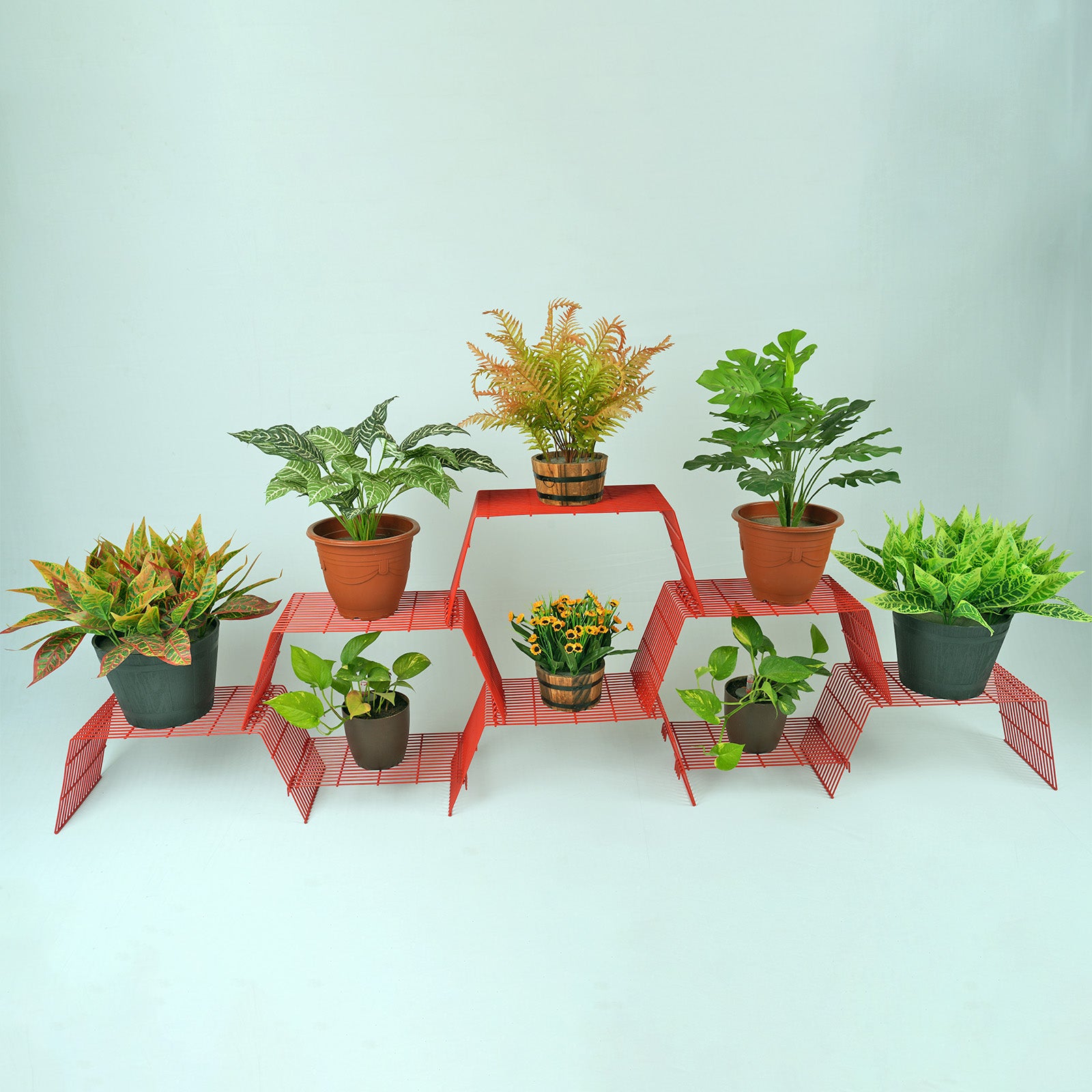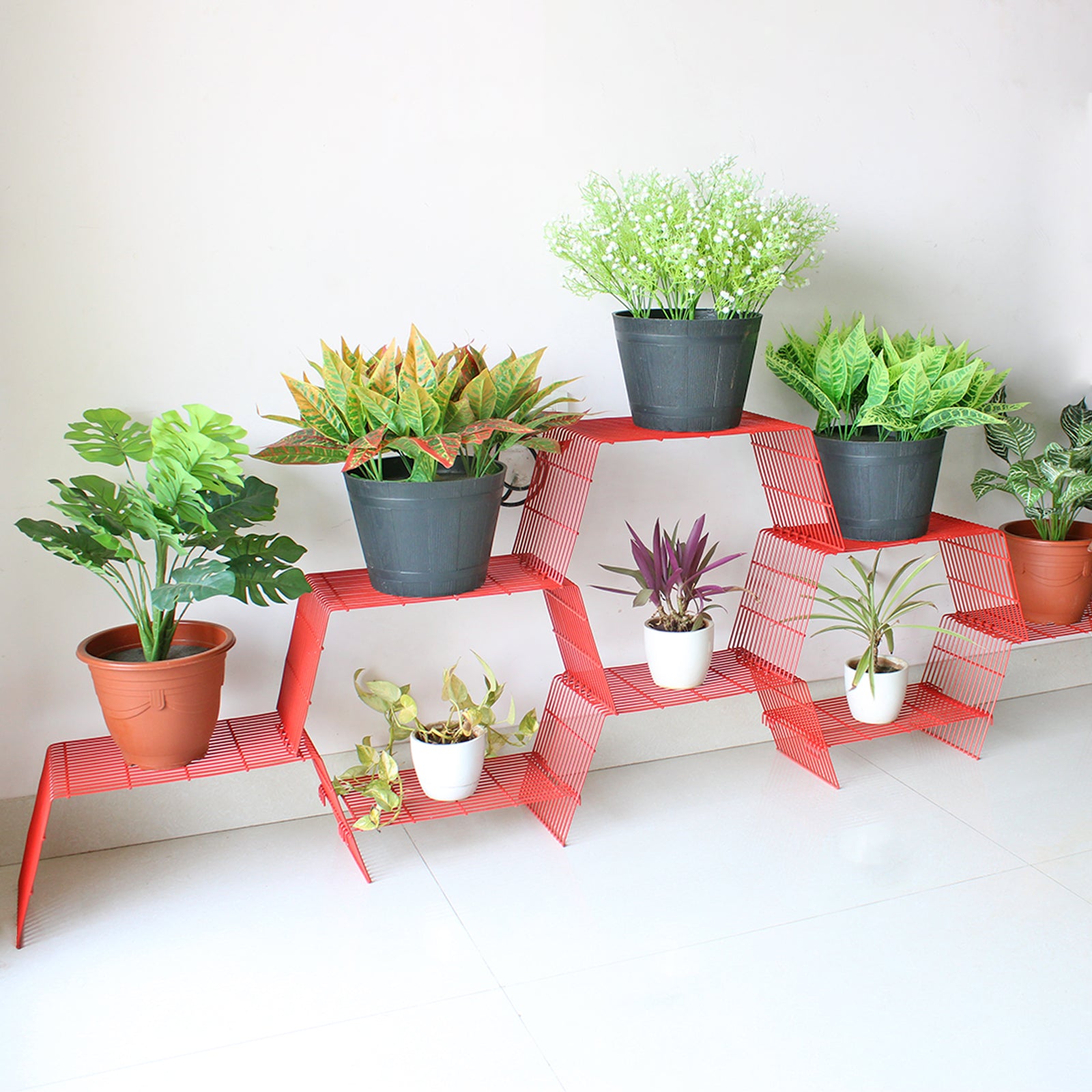 ORGANISE WITH STYLE: Create a mesmerizing honeycomb pattern by arranging multiple GRANDIS plant stands, adding a touch of elegance and harmony to your space. Plants and pots can be added to multiple heights adding to your garden decor. Transform your living space into a lush oasis and let your plants thrive in a visually stunning and organized display.