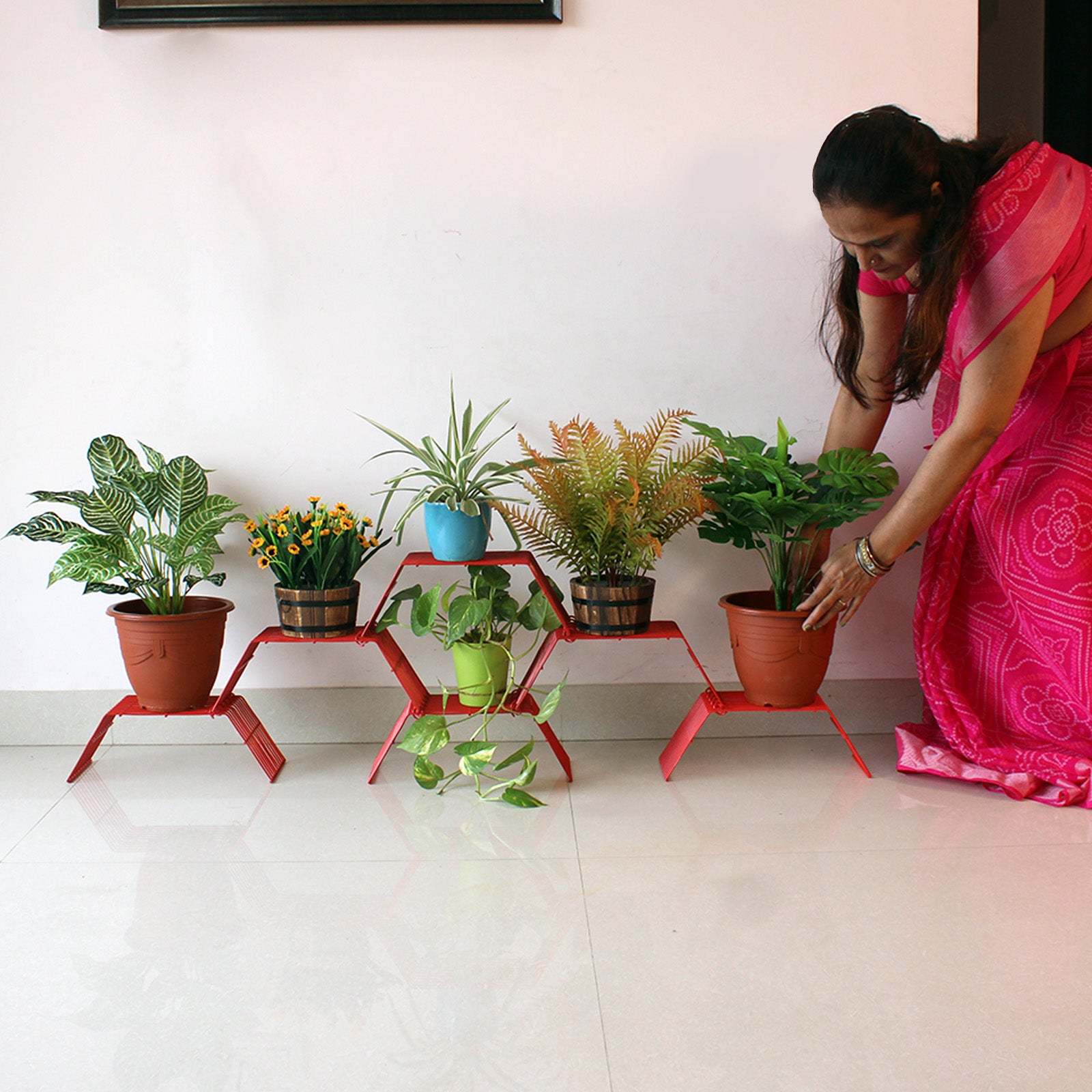 ORGANISE WITH STYLE: Create a mesmerizing honeycomb pattern by arranging multiple GRANDIS plant stands, adding a touch of elegance and harmony to your space. Plants and pots can be added to multiple heights adding to your garden decor. Transform your living space into a lush oasis and let your plants thrive in a visually stunning and organized display.