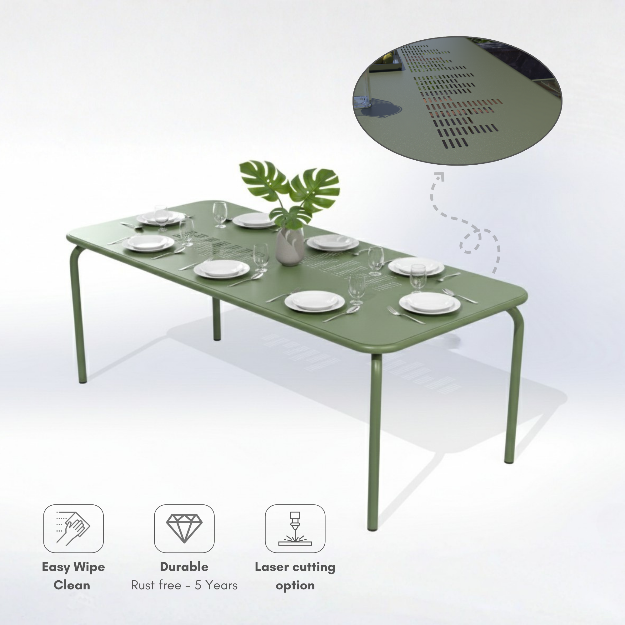 Manufactured to precision with sheet metal top and MS legs finished with exterior grade dual coat powder coating, it can withstand the test of environment and time. Available with laser cut design option on sheet metal top OR HPL/engineered wood top Solido series of tables connect to outdoor life through its simple and reliable designs.