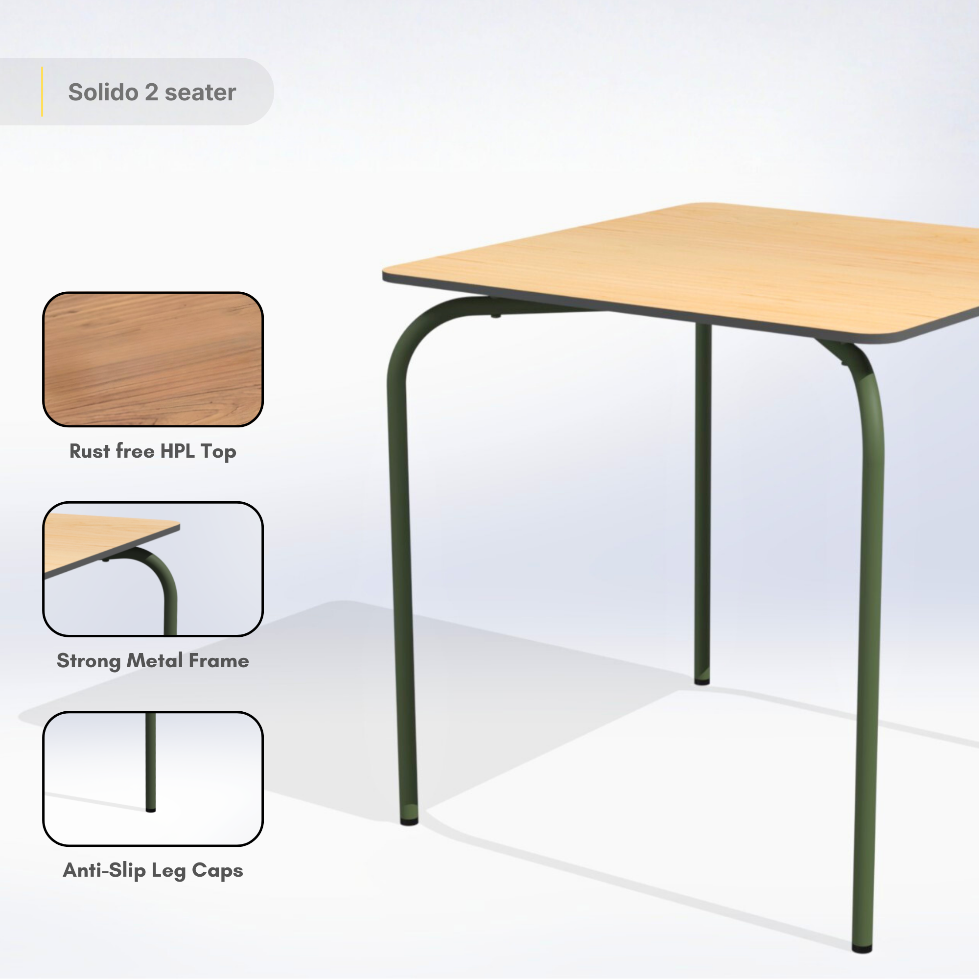 Manufactured to precision with sheet metal top and MS legs finished with exterior grade dual coat powder coating, it can withstand the test of environment and time. Available with laser cut design option on sheet metal top OR HPL/engineered wood top Solido series of tables connect to outdoor life through its simple and reliable designs.