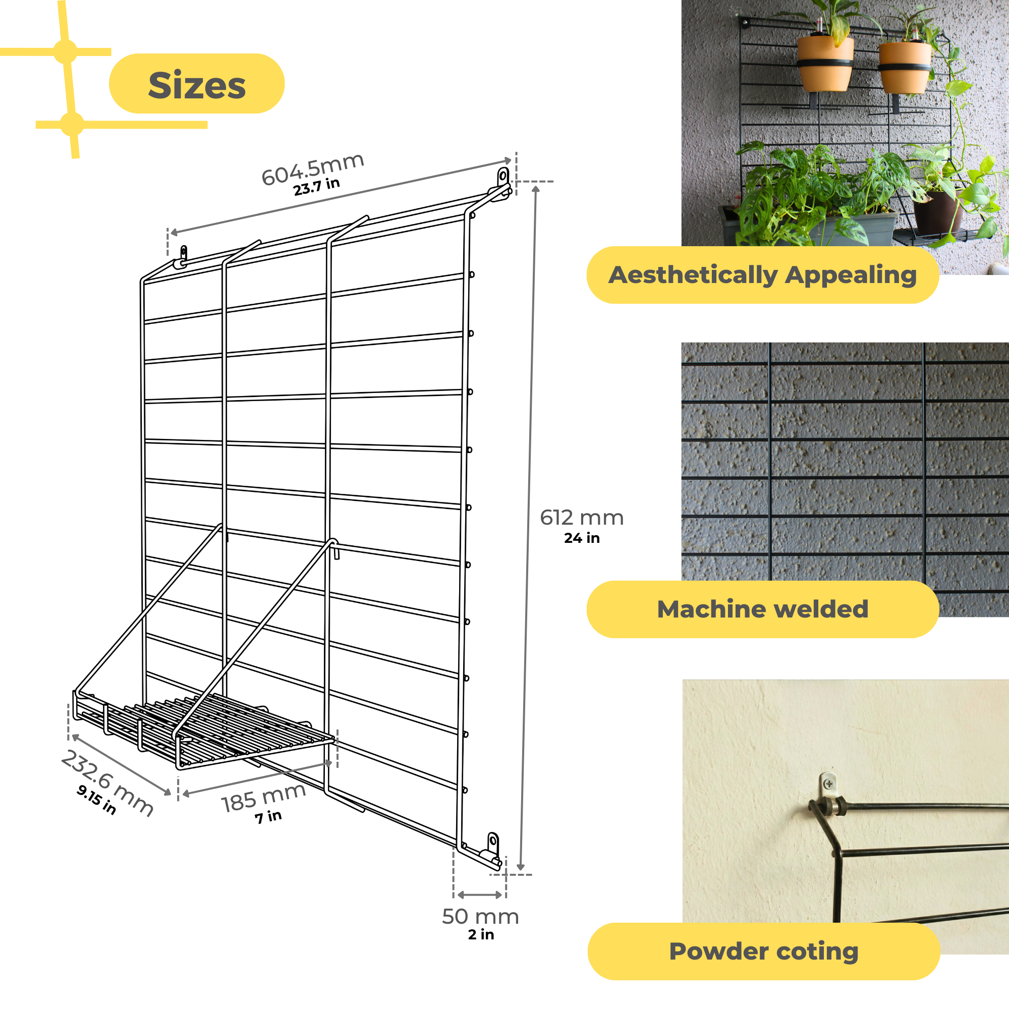 DURABLE- LONG RUST FREE LIFE: Durability is at the core of Grellis Grid's design as it will be exposed to environmental elements and will be regularly watered. The highly rust-resistant GI wire mesh, meticulously machine-welded and powder-coated in a controlled environment, ensures a long and rust-free life. This makes Grellis Grid withstand the elements, be it rain or shine, without compromising its beauty. Let this rust proof pot hanging grame be your constant companion, whether gracing your balcony, verandah, living room, window or entrance foyer.