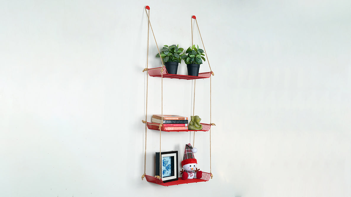 VERSATILE ARRANGEMENTS, MODULAR FREEDOM, UNIQUE AESTHETIC: The design of this wall shelf allows you to add multiple layers and racks, thus giving you complete freedom to personalize your home. Its available as one, two and three tiers, its modular jute and bead arrangements allows you to add on an extra tier without any worry. Red, grey, and white colours give you the option to organize in style to suit your personal style and space.